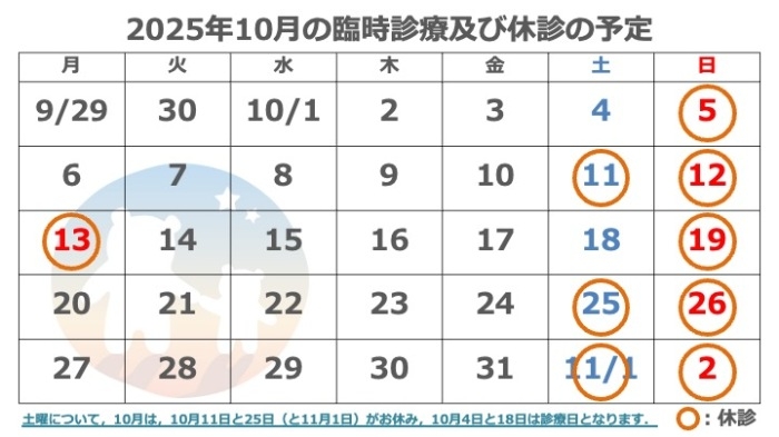2025年10月の診療が,土曜について,イレギュラーになります.