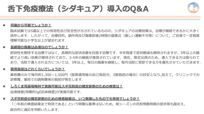 今秋から当院でも初回導入を開始したスギ花粉症に対する舌下免疫療法(シダキュア)について,